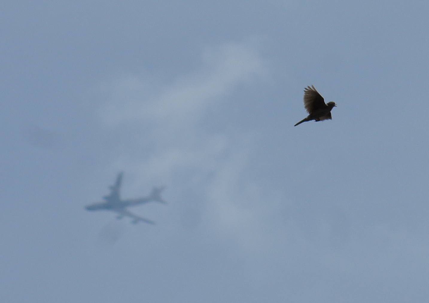 In the long grasses in the middle of the park I could hear several Skylarks. They were flying up high singing away, then gently 'parachuting' back down again. Once they were in the long grass, they were hidden. They are lots of 'paths' been cut through the long grasses, I just wish there were signs up asking people to stick to them. Several kids and dogs were running through the long grass, I hope no nests were trampled on. On one of the grass 'paths' I flushed a Skylark and just about managed to get a photo of its 'behind'. The bird turned and I could make out it was carrying food. Another photo I managed to grab was a Skylark silhouette, with a plane silhouette in the same frame.